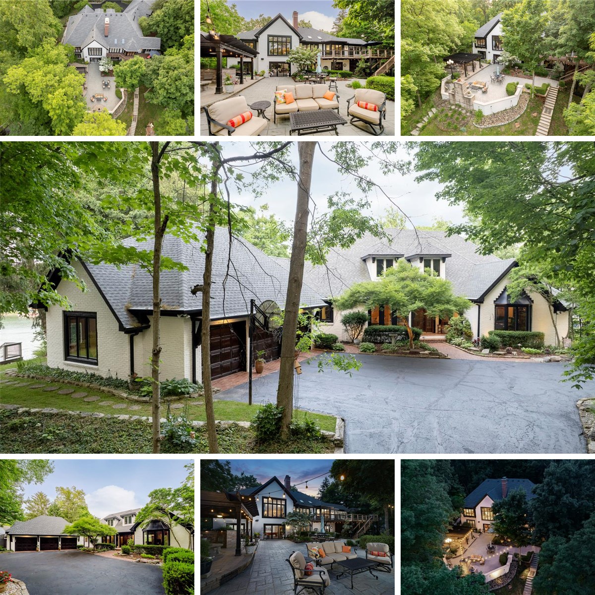Welcome to this stunning 5BR, 4.5BA lakefront home located on a quiet cul-de-sac w/ nearly 1 acre of wooded privacy & approx. 180' of shoreline—one of the largest on the lake. A private drive leads to this all-brick retreat offering serene water views, flexible living space, & exceptional outdoor entertaining. Step into a large tiled foyer leading to a spacious FR w/ lake views & large windows. Main level features an office w/ built-ins & French doors, primary suite w/ tray ceiling, lake views, walk-in closet & private BA. Gourmet kitchen includes granite counters, SS appls, custom cabs w/ built-in bar, & breakfast nook overlooking the lake. Vaulted 3-season room opens to Trex deck & flows to a large stone patio—an entertainer’s dream, perfect for large gatherings, outdoor dining, music & sunset views.The hearth room off the kitchen includes a see-through gas FP, wood beams & built-ins. Upstairs offers a private guest/in-law suite w/ sitting area & remodeled full BA. Walkout lower level lives like a 2nd home w/ 3BRs, 2 remodeled full baths, wet bar, gym, large brick wood-burning FP w/ gas starter, new wood-look tile & carpet. Unfinished space w/ epoxy flooring is perfect for storage, workshop or hobbies. Sliding doors open to a freshly sealed patio, brick retaining wall, firepit, lakeside pergola & deeded dock w/ lift.